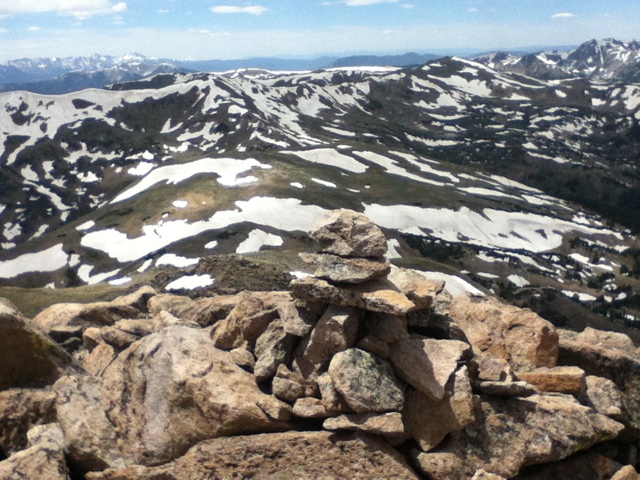 Hiked around Copper Mtn and Wheeler Flats Ski/golf megapolis. Skipped stopping in this huge tourist trap. Started the Grays-Torrey's Peak alternate which begins with a long climb to the ridge and peaks. Great views and of course lots of snow to mush through on the north side on the long climb down to where you can get a free bus into Breckenridge. The owners of the Fireside Inn(and dorm) are very hiker friendly, did my laundry for me and they have a hot tub!
